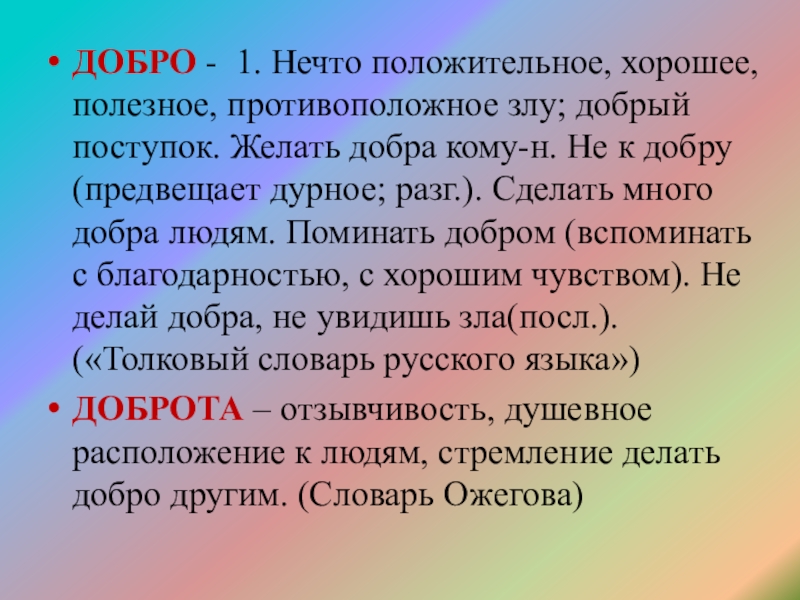 ДОБРО - 1. Нечто положительное, хорошее, полезное, противоположное злу; добрый поступок.
