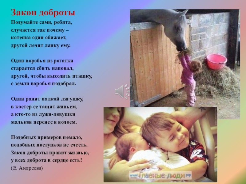 Закон добротыПодумайте сами, ребята,случается так почему –котенка один обижает,другой лечит лапку ему.Один воробья из рогаткистарается сбить наповал,другой,