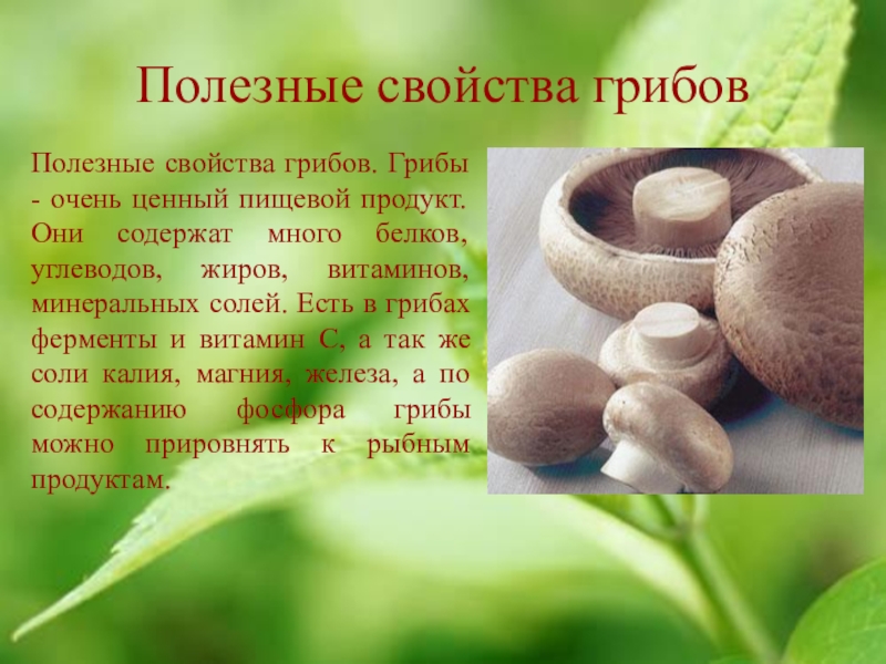 Полезные свойства грибовПолезные свойства грибов. Грибы - очень ценный пищевой продукт. Они содержат много белков, углеводов, жиров,
