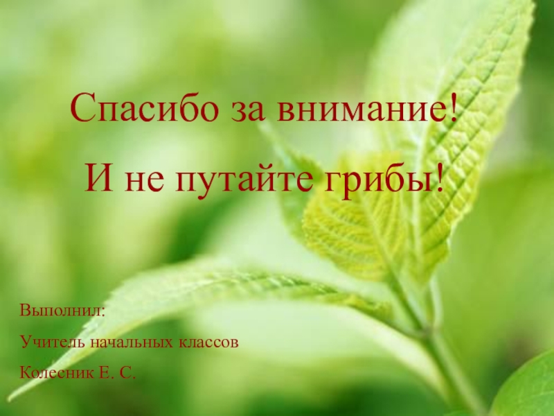 Спасибо за внимание!И не путайте грибы!Выполнил:Учитель начальных классовКолесник Е. С.