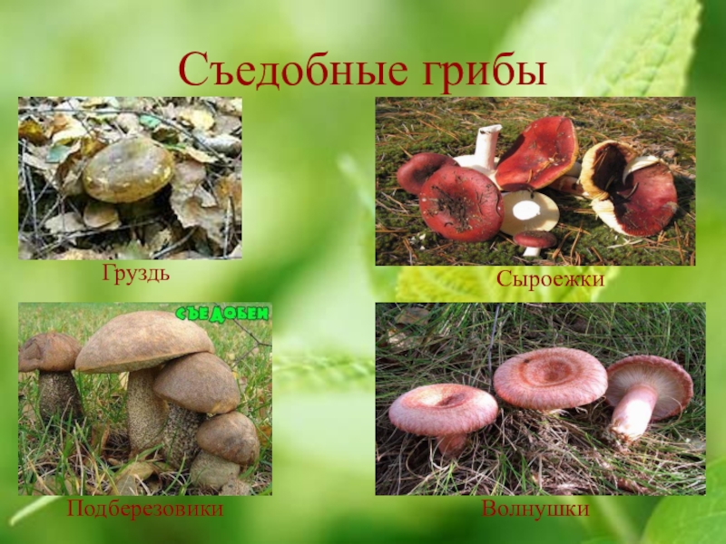 Съедобные грибыГруздьСыроежкиПодберезовикиВолнушки