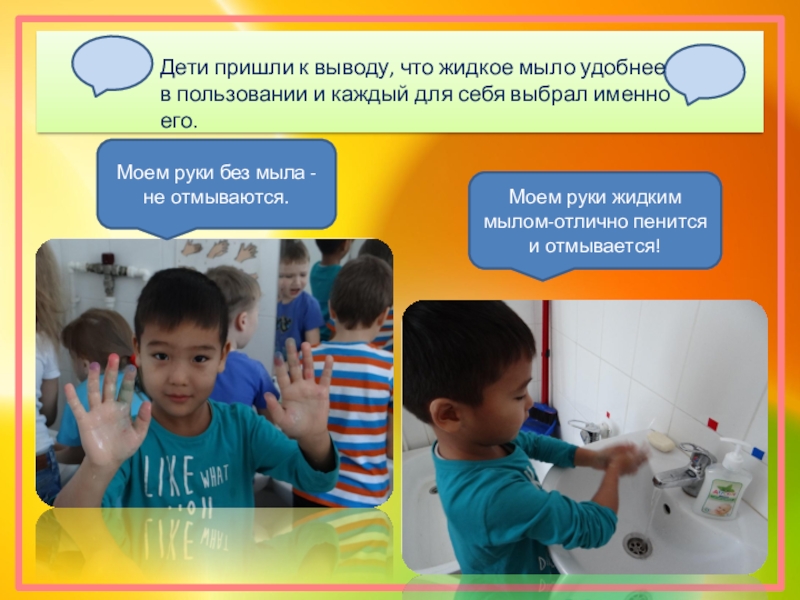 Дети пришли к выводу, что жидкое мыло удобнее в пользовании и каждый для себя выбрал именно его.