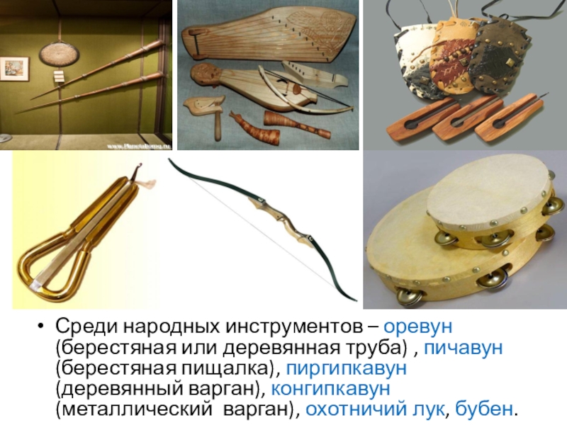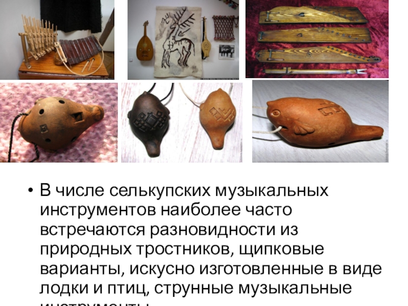Слайд 6В числе селькупских музыкальных инструментов наиболее часто встречаются разновидности из природных