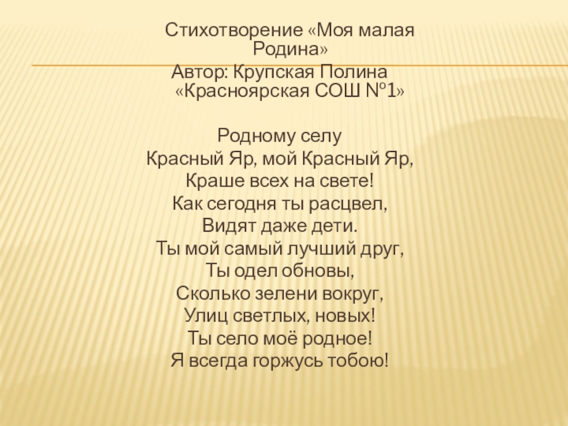 Стихотворение «Моя малая Родина»                 Автор: Крупская Полина «Красноярская СОШ №1» Родному селуКрасный Яр, мой Красный Яр,Краше всех на свете!Как
