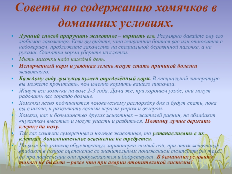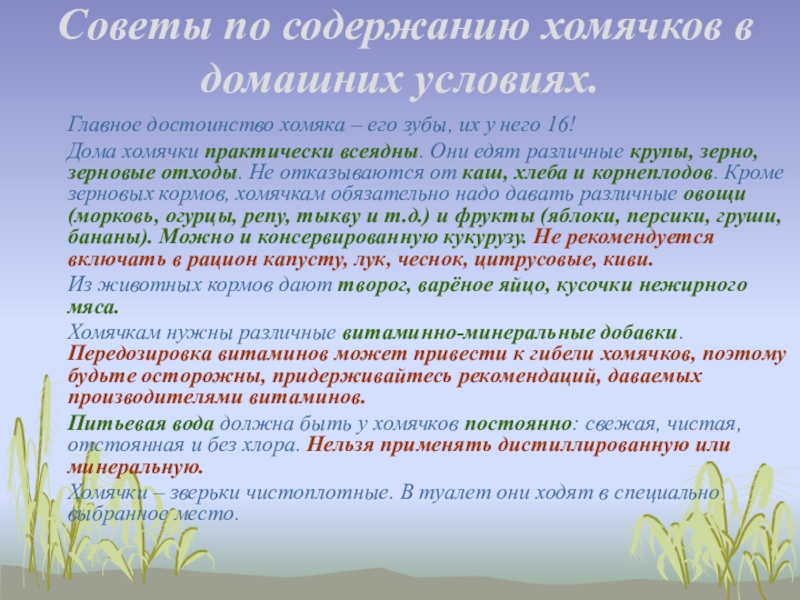 Слайд 12Советы по содержанию хомячков в домашних условиях.