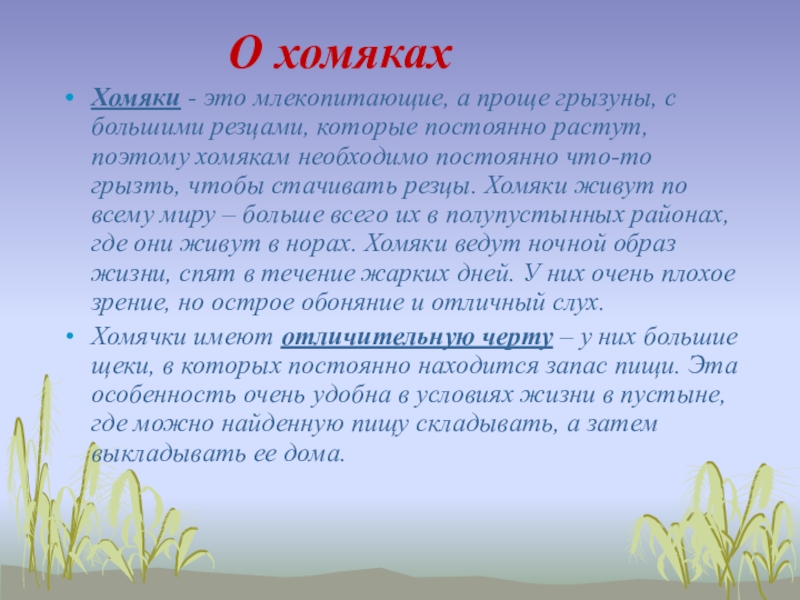 которые постоянно растут, поэтому хомякам необходимо постоянно что-то грызть, чтобы стачивать резцы. Хомяки живут по всему миру – больше всего их в полупустынных районах, где они живут в норах. Хомяки ведут ночной образ жизни, спят в течение жарких дней. У них очень плохое зрение, но острое обоняние и отличный слух.