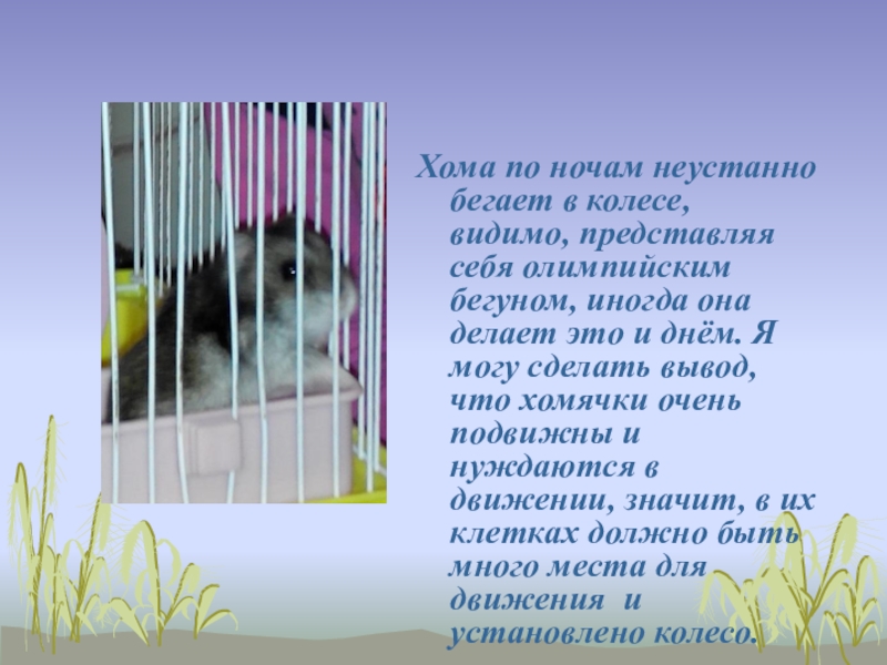 бегуном, иногда она делает это и днём. Я могу сделать вывод, что хомячки очень подвижны и нуждаются в движении, значит, в их клетках должно быть много места для движения и установлено колесо.