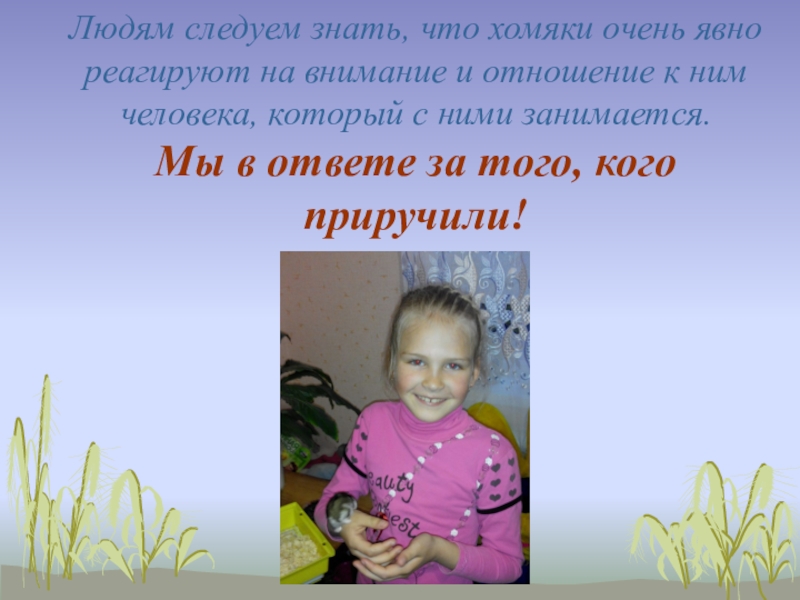 Слайд 13Людям следуем знать, что хомяки очень явно реагируют на внимание и