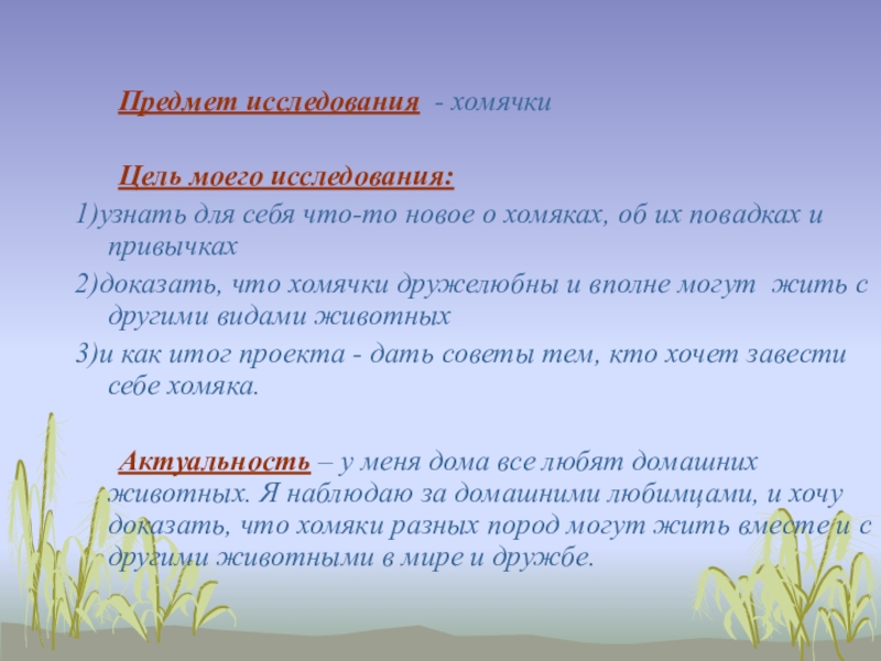 Актуальность – у меня дома все любят домашних животных. Я наблюдаю за домашними любимцами, и хочу доказать, что хомяки разных пород могут жить вместе и с другими животными в мире и дружбе.