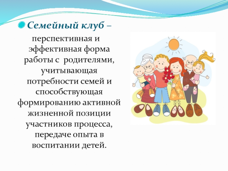 Слайд 4Семейный клуб – это перспективная форма работы с семьей, учитывающая актуальные потребности семьи,