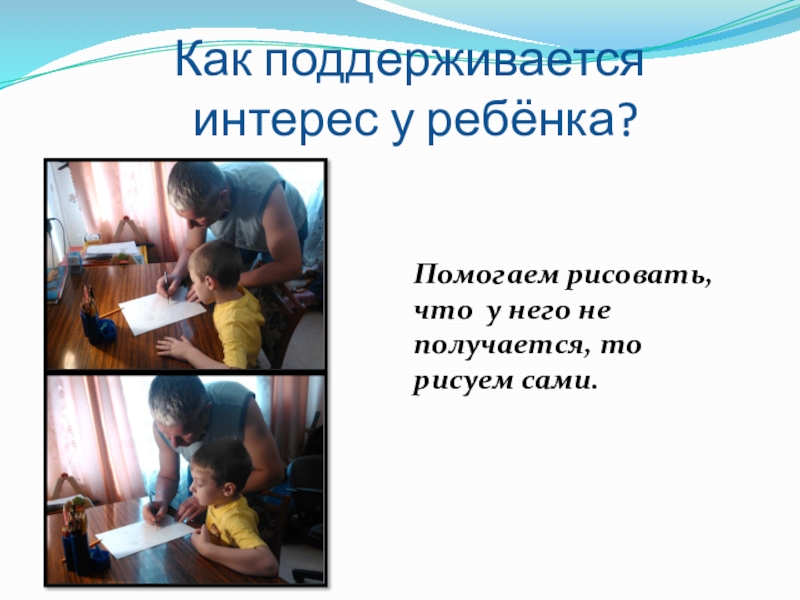 Помогаем рисовать, что у него не получается, то  рисуем сами. Как поддерживается  интерес у ребёнка?