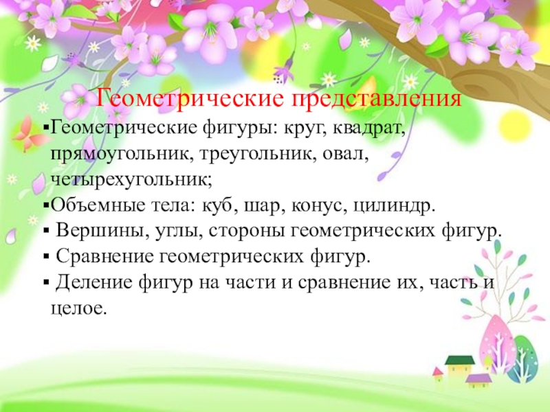 Геометрические представленияГеометрические фигуры: круг, квадрат, прямоугольник, треугольник, овал, четырехугольник; Объемные тела: куб, шар, конус, цилиндр. Вершины, углы,