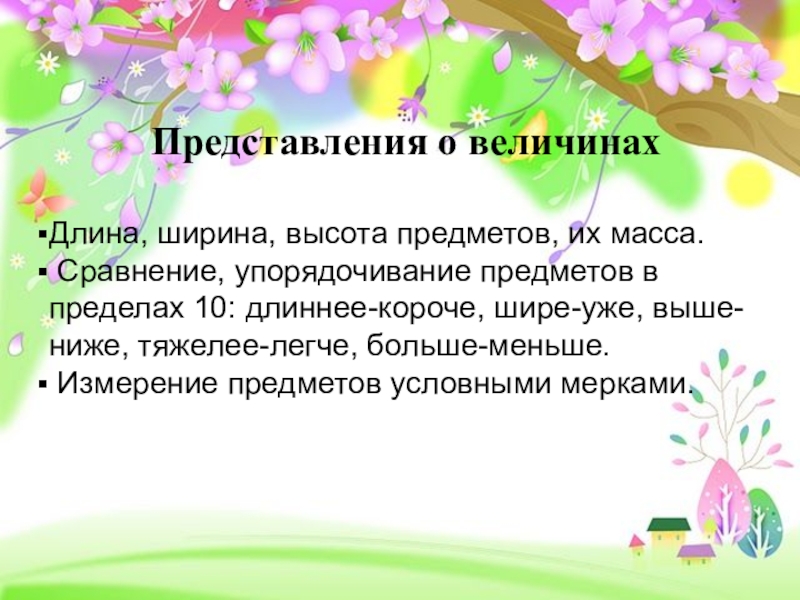 Представления о величинахДлина, ширина, высота предметов, их масса. Сравнение, упорядочивание предметов в пределах 10: длиннее-короче, шире-уже, выше-ниже,