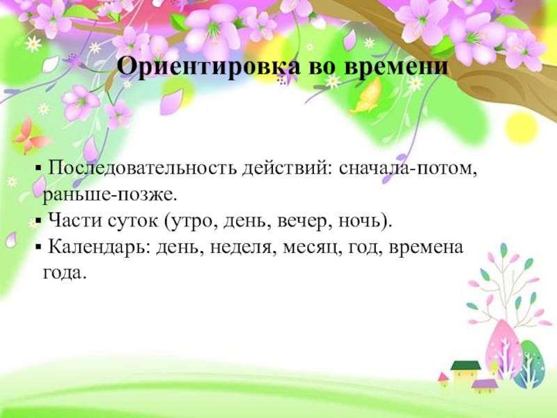 Ориентировка во времени Последовательность действий: сначала-потом, раньше-позже. Части суток (утро, день, вечер, ночь). Календарь: день, неделя, месяц,
