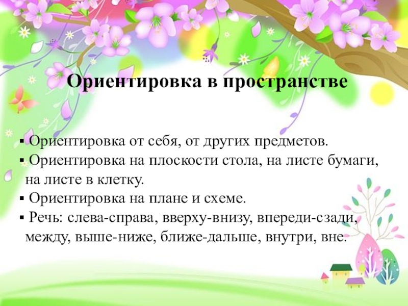 Ориентировка в пространстве Ориентировка от себя, от других предметов. Ориентировка на плоскости стола, на листе бумаги, на