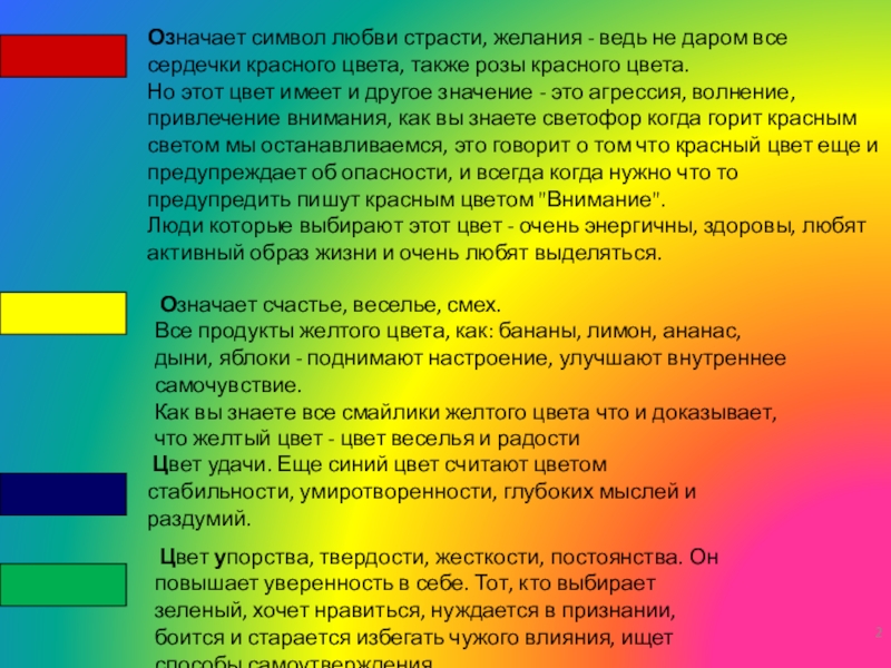 Цвет упорства, твердости, жесткости, постоянства. Он повышает уверенность в себе. Тот, кто выбирает зеленый, хочет нравиться, нуждается в признании, боится и старается избегать чужого влияния, ищет способы самоутверждения.