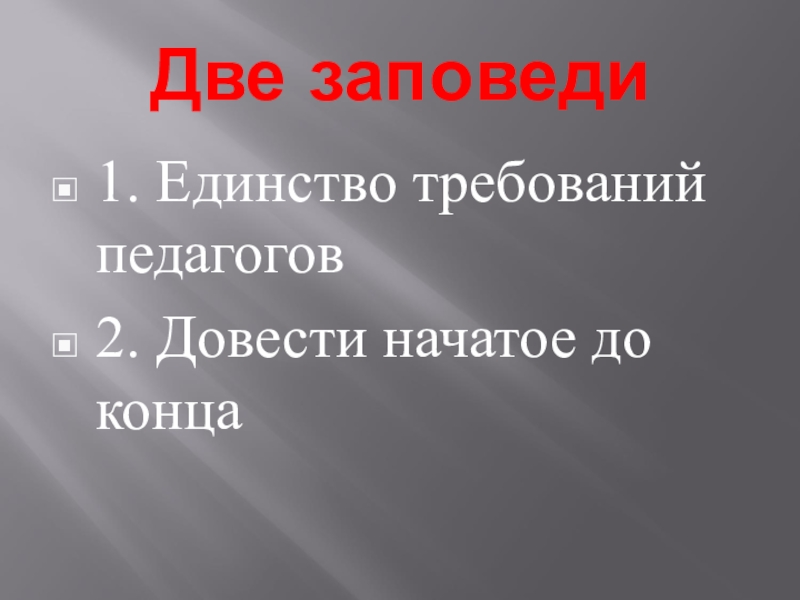 Две заповеди1. Единство требований педагогов2. Довести начатое до конца