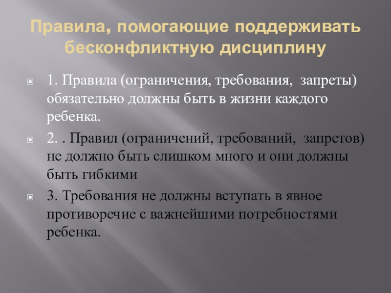 Правила, помогающие поддерживать бесконфликтную дисциплину1. Правила (ограничения, требования, запреты) обязательно должны быть в жизни каждого ребенка.2. . Правил (ограничений, требований, запретов) не должно быть слишком много и они должны быть гибкими3. Требования не должны вступать в