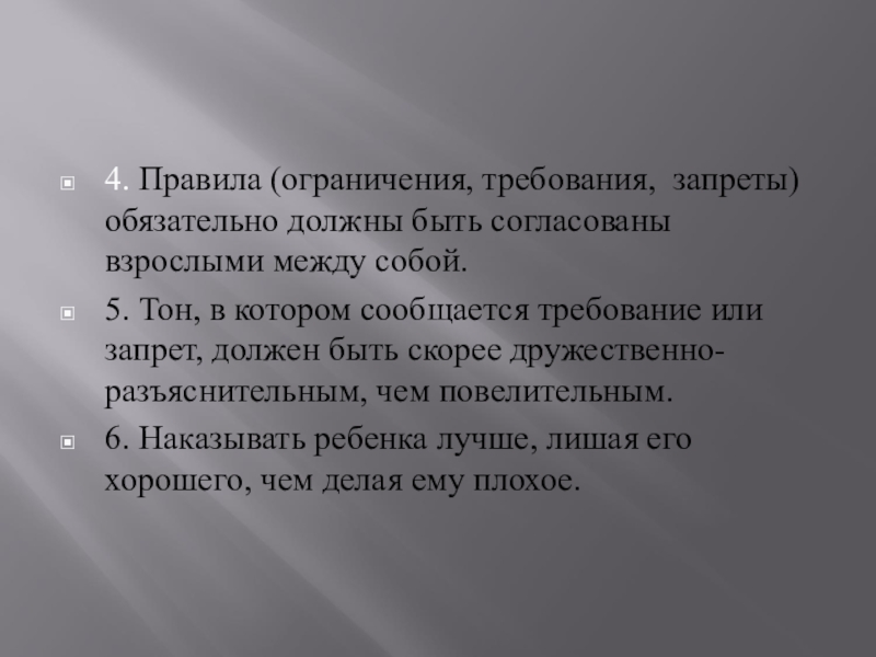 4. Правила (ограничения, требования, запреты) обязательно должны быть согласованы взрослыми между собой.5. Тон, в котором сообщается требование