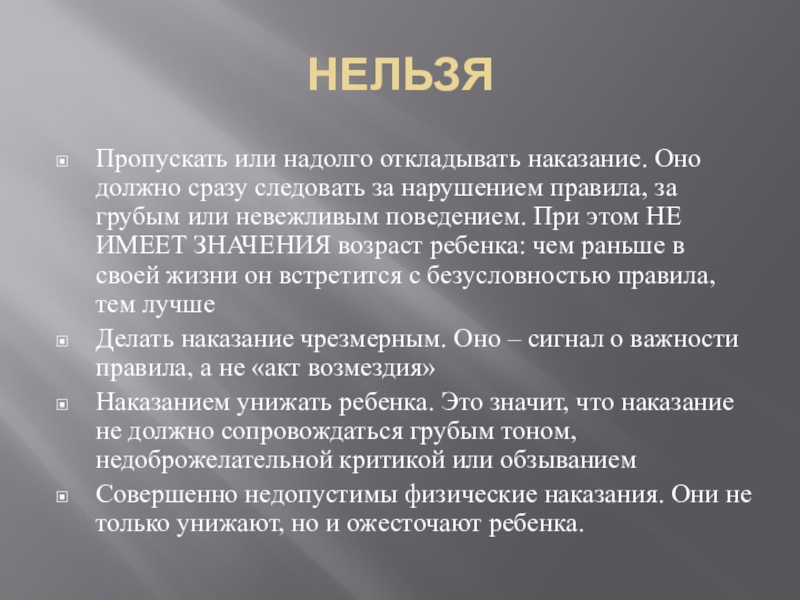 НЕЛЬЗЯПропускать или надолго откладывать наказание. Оно должно сразу следовать за нарушением правила, за грубым или невежливым поведением.