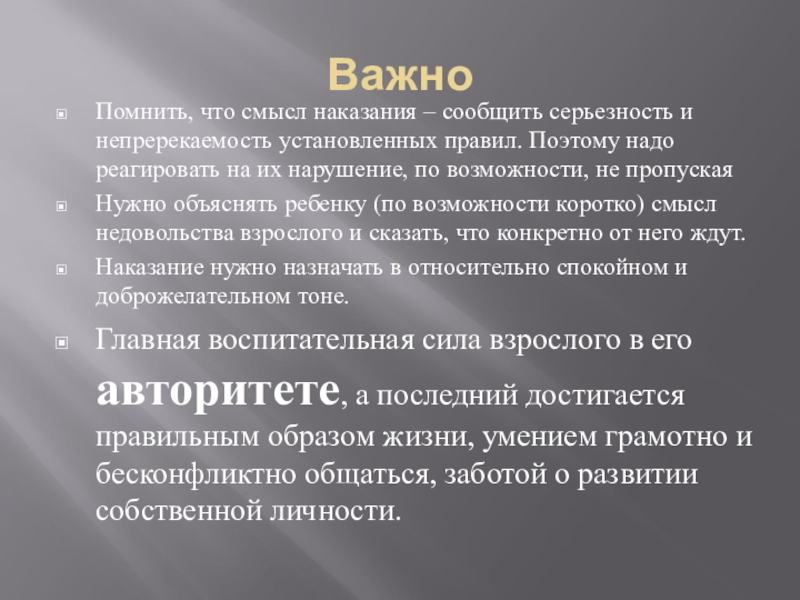 Помнить, что смысл наказания – сообщить серьезность и непререкаемость установленных правил.