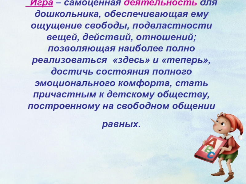 Слайд 4 Игра – самоценная деятельность для дошкольника, обеспечивающая ему ощущение свободы,