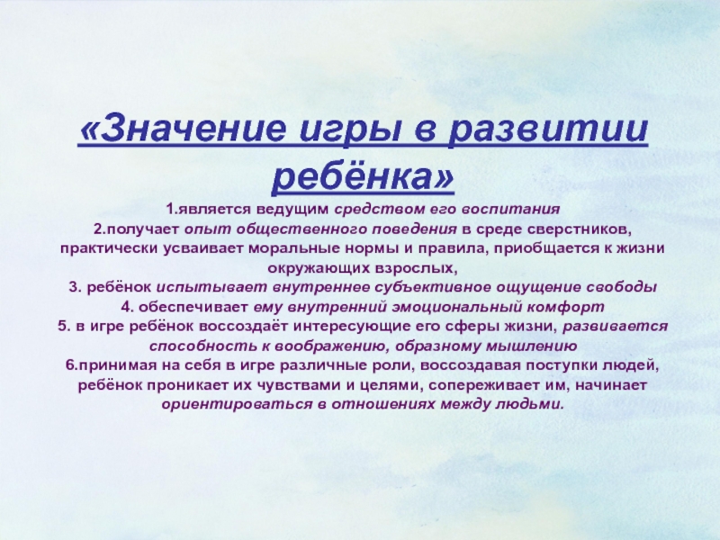 Слайд 6«Значение игры в развитии ребёнка»