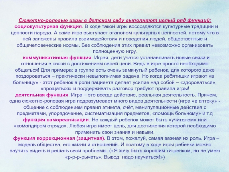 Сюжетно-ролевые игры в детском саду выполняют целый ряд функций: