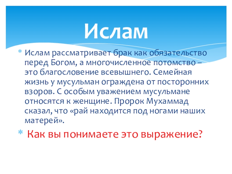 ИсламИслам рассматривает брак как обязательство перед Богом, а многочисленное потомство – это благословение всевышнего. Семейная жизнь у