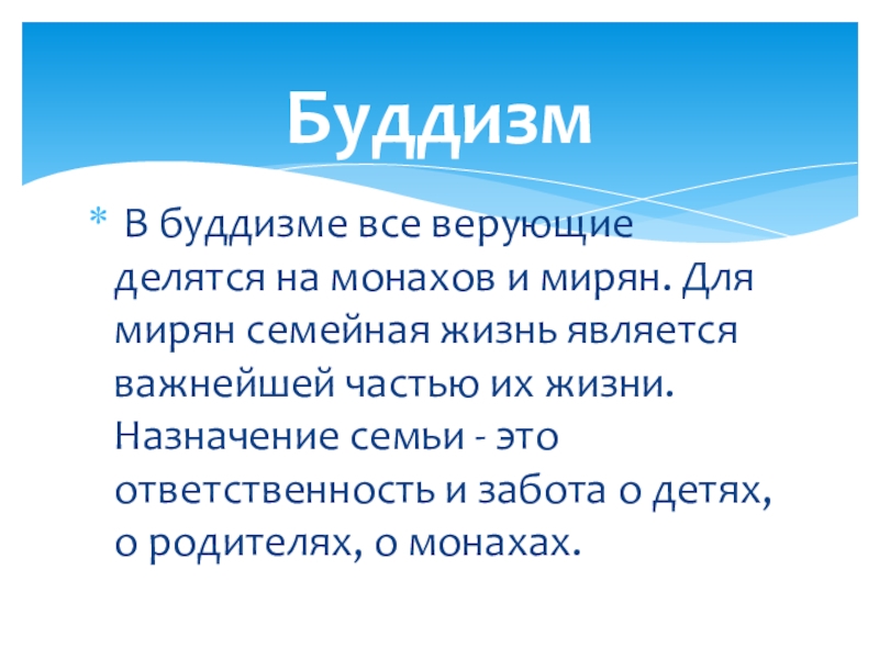 Буддизм В буддизме все верующие делятся на монахов и мирян. Для мирян семейная жизнь является важнейшей частью