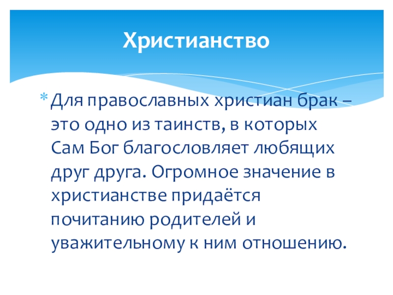 ХристианствоДля православных христиан брак – это одно из таинств, в которых Сам Бог благословляет любящих друг друга.