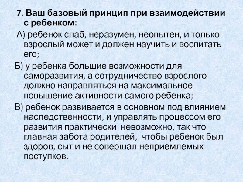 Слайд 16 7. Ваш базовый принцип при взаимодействии с ребенком: