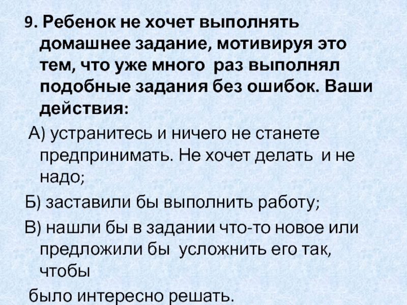 Слайд 189. Ребенок не хочет выполнять домашнее задание, мотивируя это тем, что
