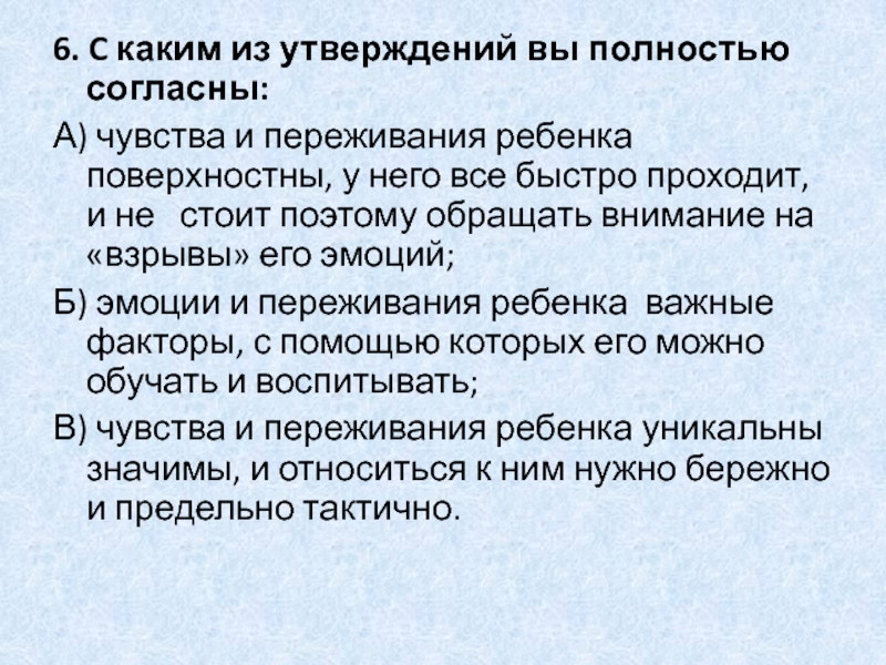 В) чувства и переживания ребенка уникальны значимы, и относиться к ним нужно бережно и предельно тактично.