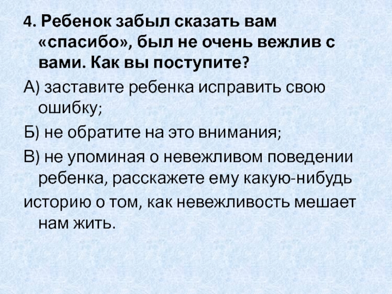В) не упоминая о невежливом поведении ребенка, расскажете ему какую-нибудь