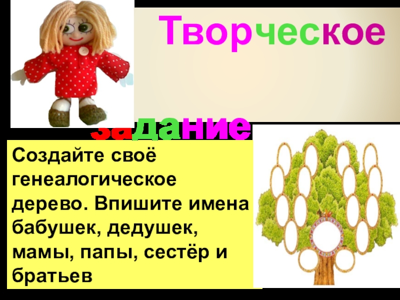 Создайте своё генеалогическое дерево. Впишите имена бабушек, дедушек, мамы, папы, сестёр и братьев