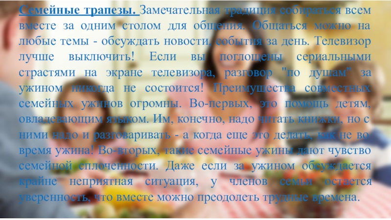 общения. Общаться можно на любые темы - обсуждать новости, события за день. Телевизор лучше выключить! Если вы поглощены сериальными страстями на экране телевизора, разговор "по душам" за ужином никогда не состоится! Преимущества совместных семейных ужинов огромны. Во-первых, это помощь детям, овладевающим языком. Им, конечно, надо читать книжки, но с ними надо и разговаривать - а когда еще это делать, как не во время ужина! Во-вторых, такие семейные ужины дают чувство семейной сплоченности. Даже если за ужином обсуждается крайне неприятная ситуация, у членов семьи остается уверенность, что вместе можно преодолеть трудные времена.