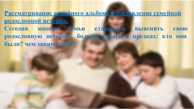 Слайд 9Рассматривание семейного альбома и составление семейной родословной истории.