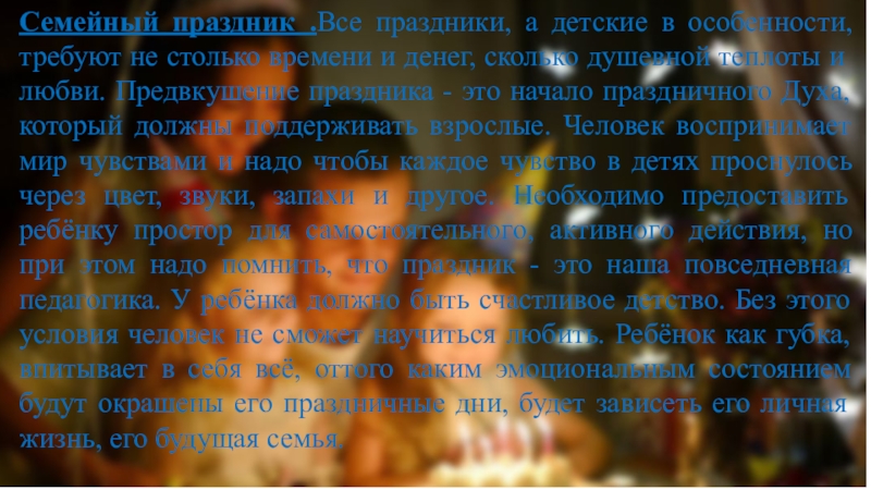 Слайд 8Семейный праздник .Все праздники, а детские в особенности, требуют не столько