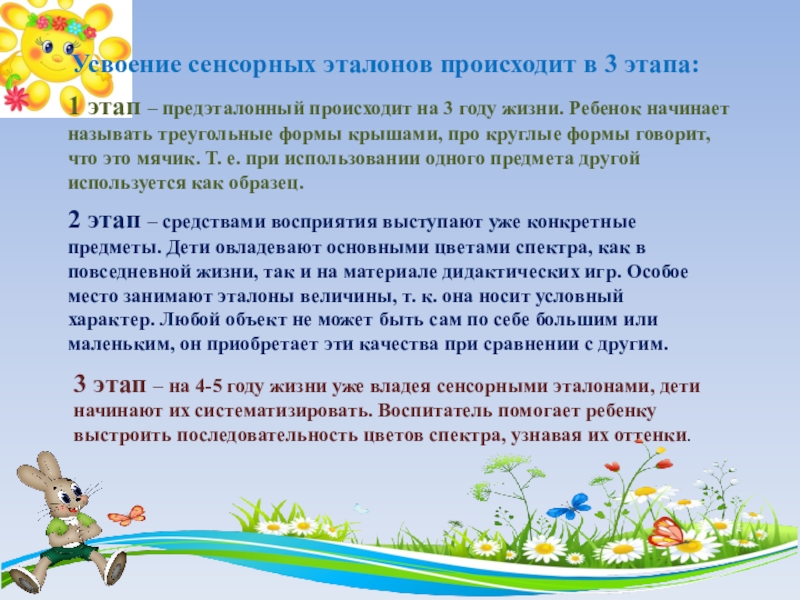 2 этап – средствами восприятия выступают уже конкретные предметы. Дети овладевают основными цветами спектра, как в повседневной жизни, так и на материале дидактических игр. Особое место занимают эталоны величины, т. к. она носит условный характер. Любой объект не может быть сам по себе большим или маленьким, он приобретает эти качества при сравнении с другим.