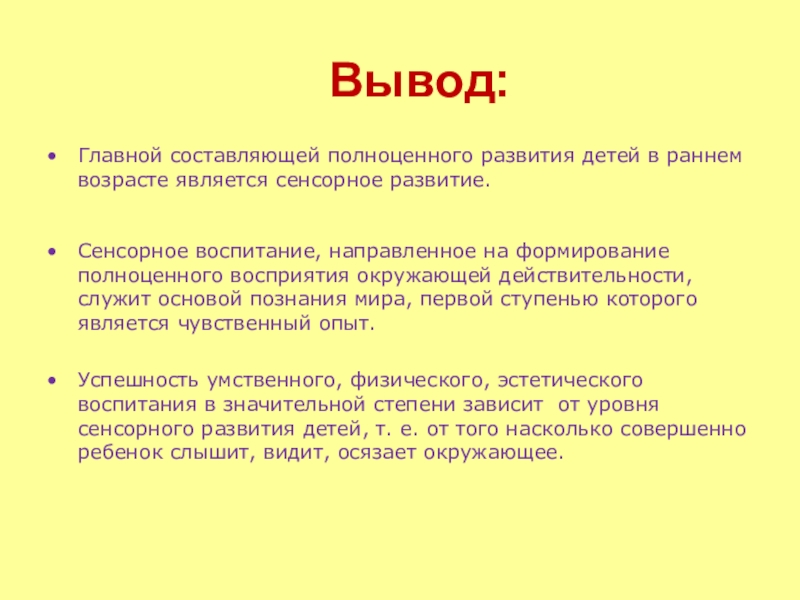 Успешность умственного, физического, эстетического воспитания в значительной степени зависит от уровня сенсорного развития детей, т. е. от того насколько совершенно ребенок слышит, видит, осязает окружающее.