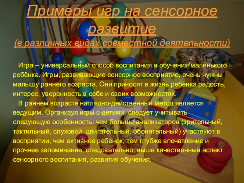 Главной составляющей полноценного развития детей в раннем возрасте является сенсорное развитие.