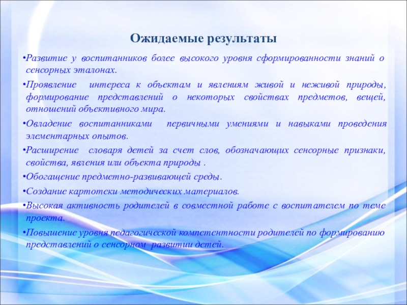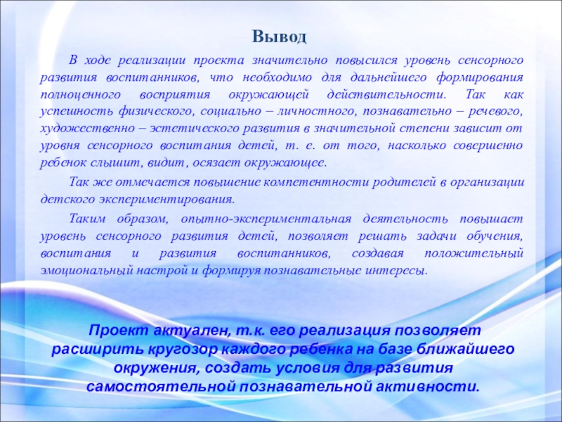 Таким образом, опытно-экспериментальная деятельность повышает уровень сенсорного развития детей, позволяет решать задачи обучения, воспитания и развития воспитанников, создавая положительный эмоциональный настрой и формируя познавательные интересы.
