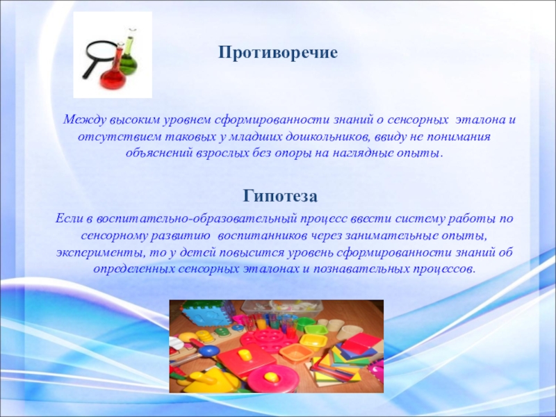 Если в воспитательно-образовательный процесс ввести систему работы по сенсорному развитию воспитанников через занимательные опыты, эксперименты, то у детей повысится уровень сформированности знаний об определенных сенсорных эталонах и познавательных процессов.
