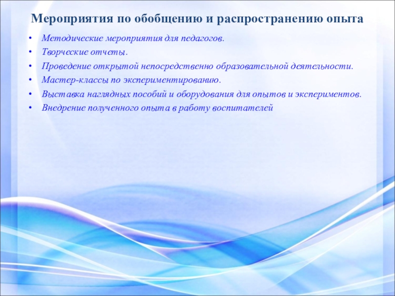 Слайд 21Мероприятия по обобщению и распространению опыта
