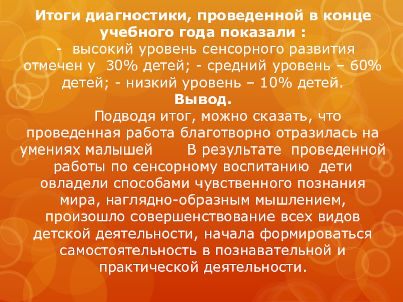 Подводя итог, можно сказать, что проведенная работа благотворно отразилась на умениях малышей В результате проведенной работы по сенсорному воспитанию дети овладели способами чувственного познания мира, наглядно-образным мышлением, произошло совершенствование всех видов детской деятельности, начала формироваться самостоятельность в познавательной и практической деятельности.