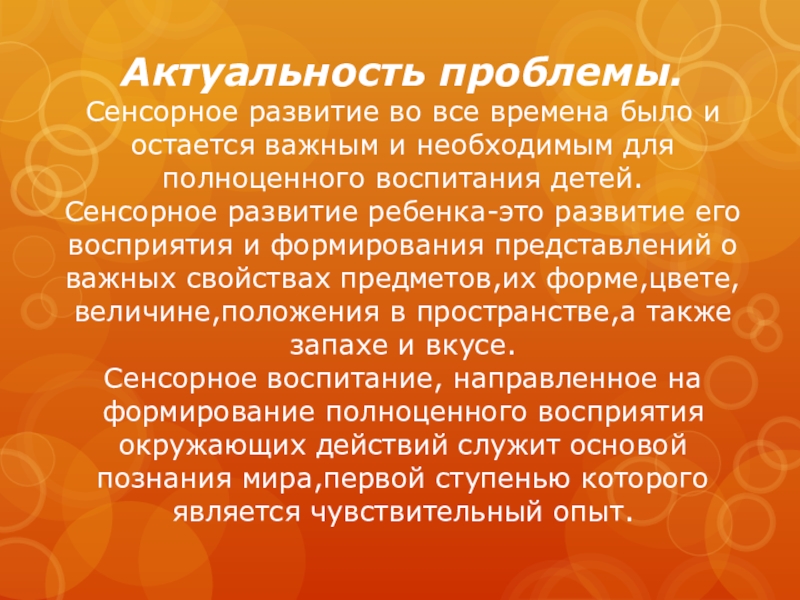 Сенсорное воспитание, направленное на формирование полноценного восприятия окружающих действий служит основой познания мира,первой ступенью которого является чувствительный опыт.