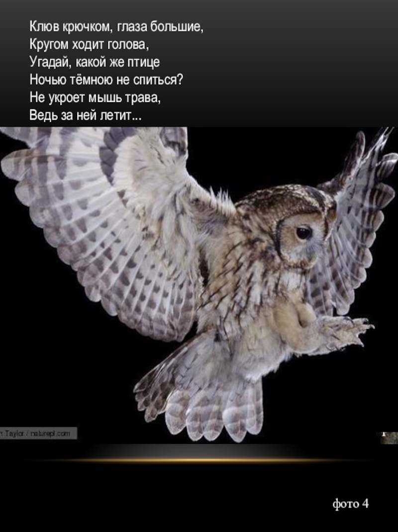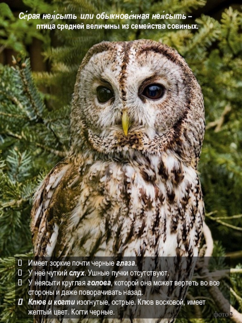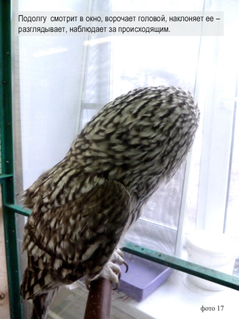 У неясыти круглая голова, которой она может вертеть во все стороны и даже поворачивать назад.