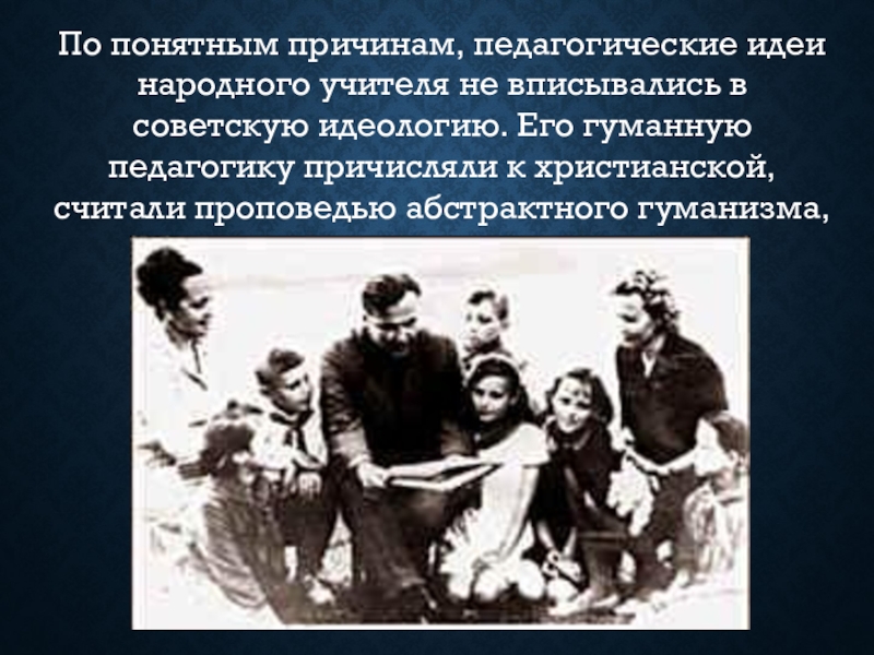 Слайд 19По понятным причинам, педагогические идеи народного учителя не вписывались в советскую