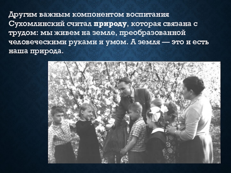 Слайд 15Другим важным компонентом воспитания Сухомлинский считал природу, которая связана с трудом: мы